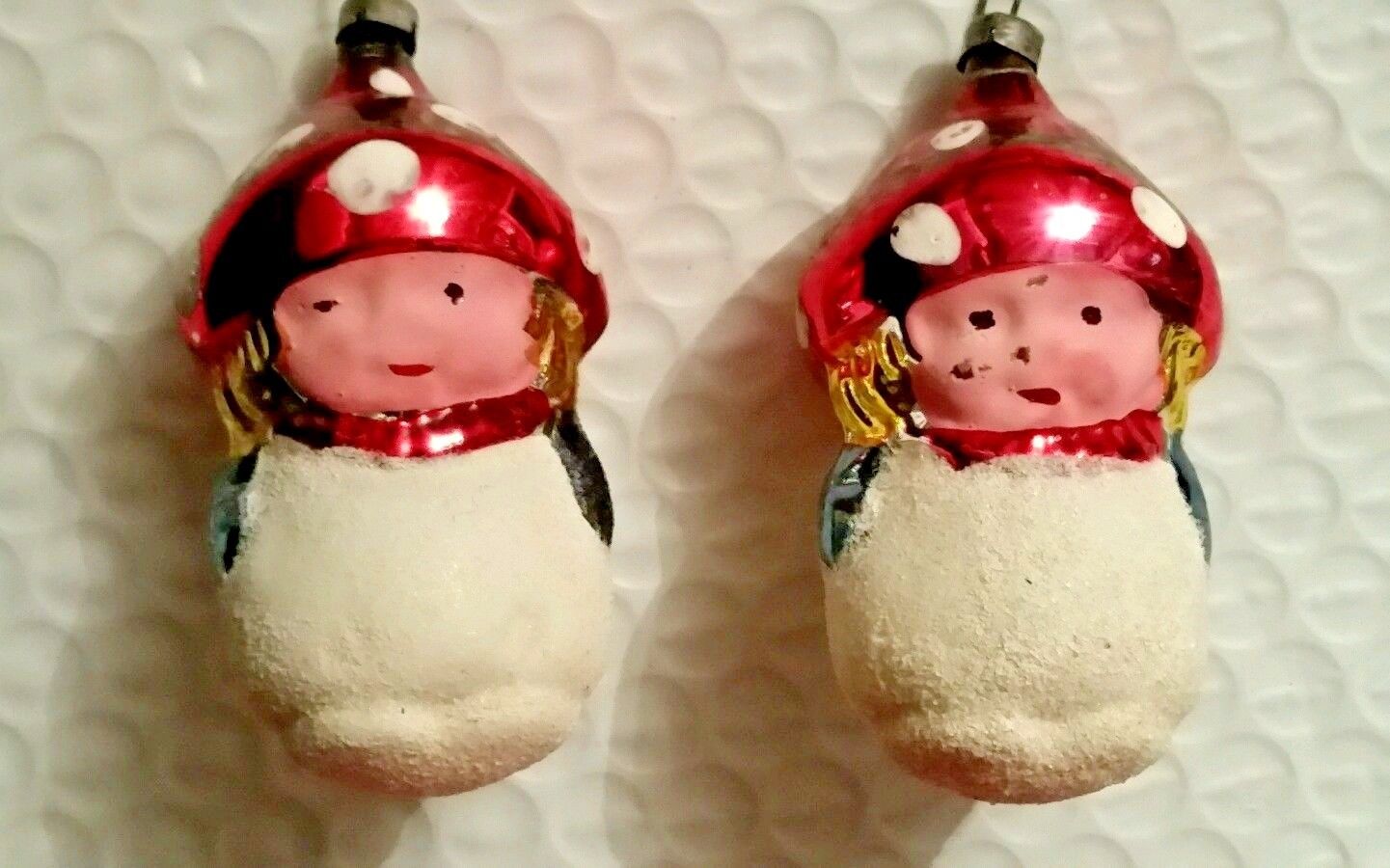 PAIR of VINTAGE MERCURY GLASS MUSHROOM GIRL FACE CHRISTMAS ORNAMENT CZECH