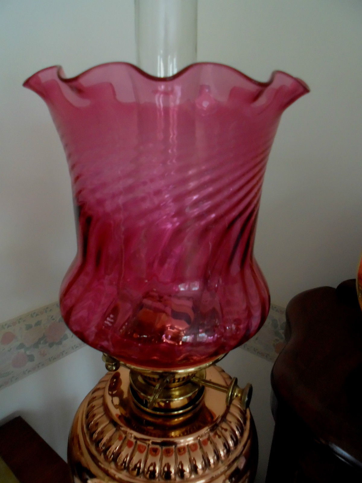 Title (ebay affiliate link): BRITISH QUALITY CRANBERRY GLASS DUPLEX OIL LAMP SHADE.