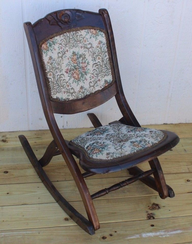 Title (ebay affiliate link): Vtg Victorian Folding Wooden Rocking Chair Tapestry Seat & Back w/ Carved Detail