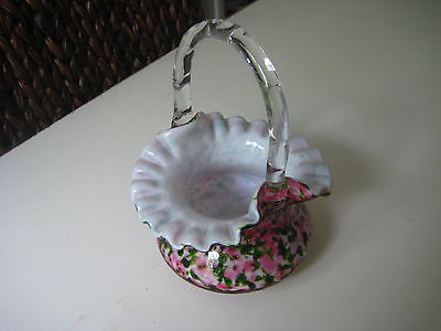 Vintage 7" Colorful FENTON ART Glass Ruffled Vase Basket Rose w/ Green