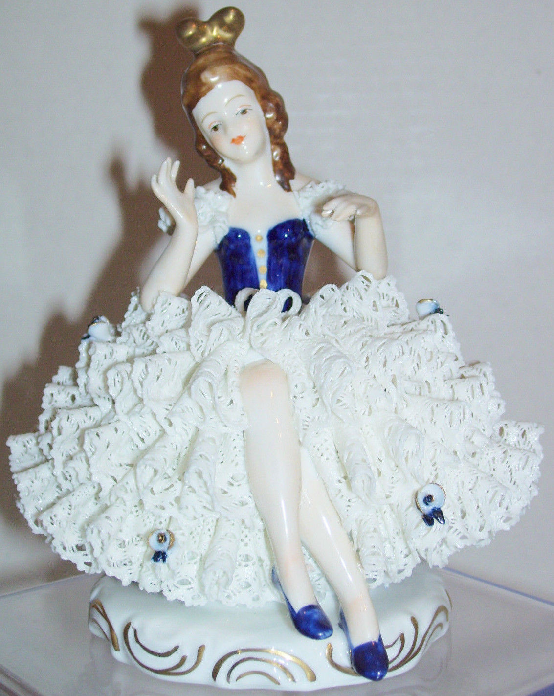 Title (ebay affiliate link): MINT Vintage Lace German Western Germany Dresden Sitting Lady 6.5" Figurine
