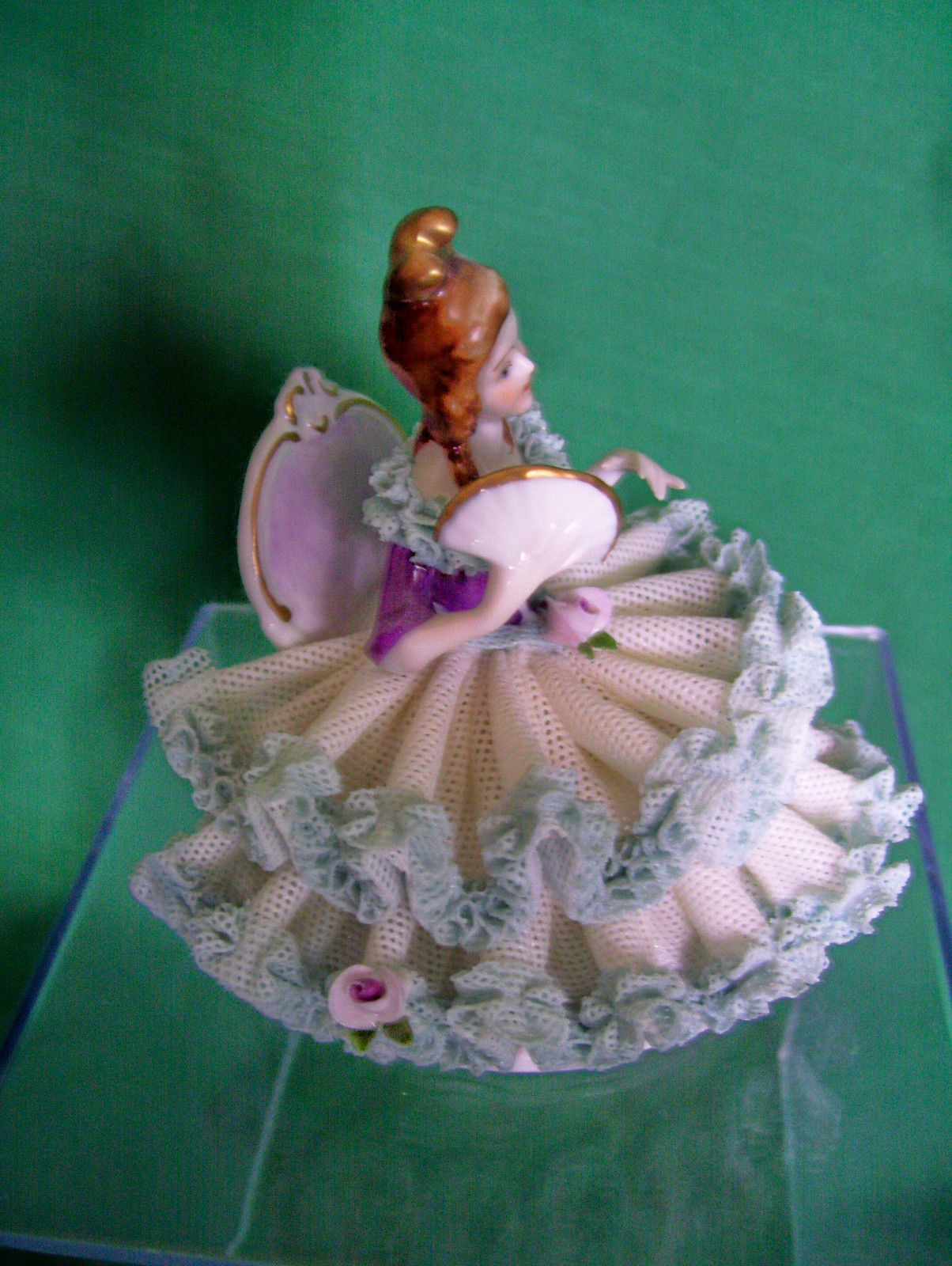 Title (ebay affiliate link): MINT Vintage Lace German Dresden Seated Lady Figurine My Pretty Fan Porcelain