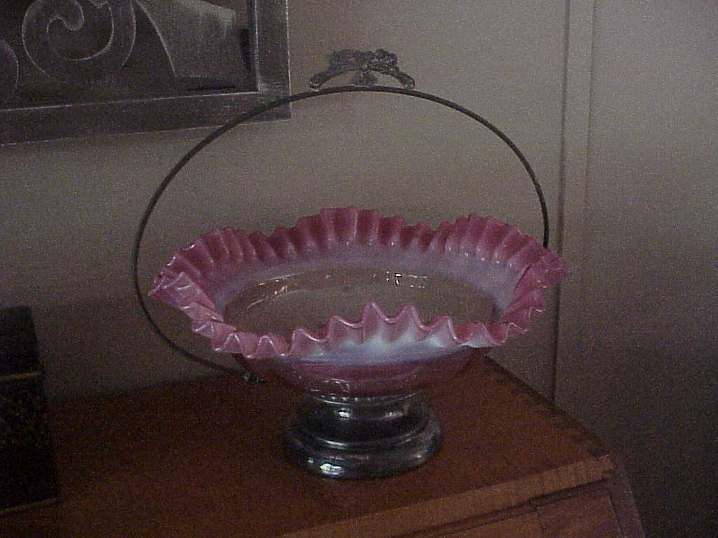 Title (ebay affiliate link): VICTORIAN CRANBERRY OPALESCENT BRIDE'S BASKET IN OLD SP HOLDER- SO PRETTY
