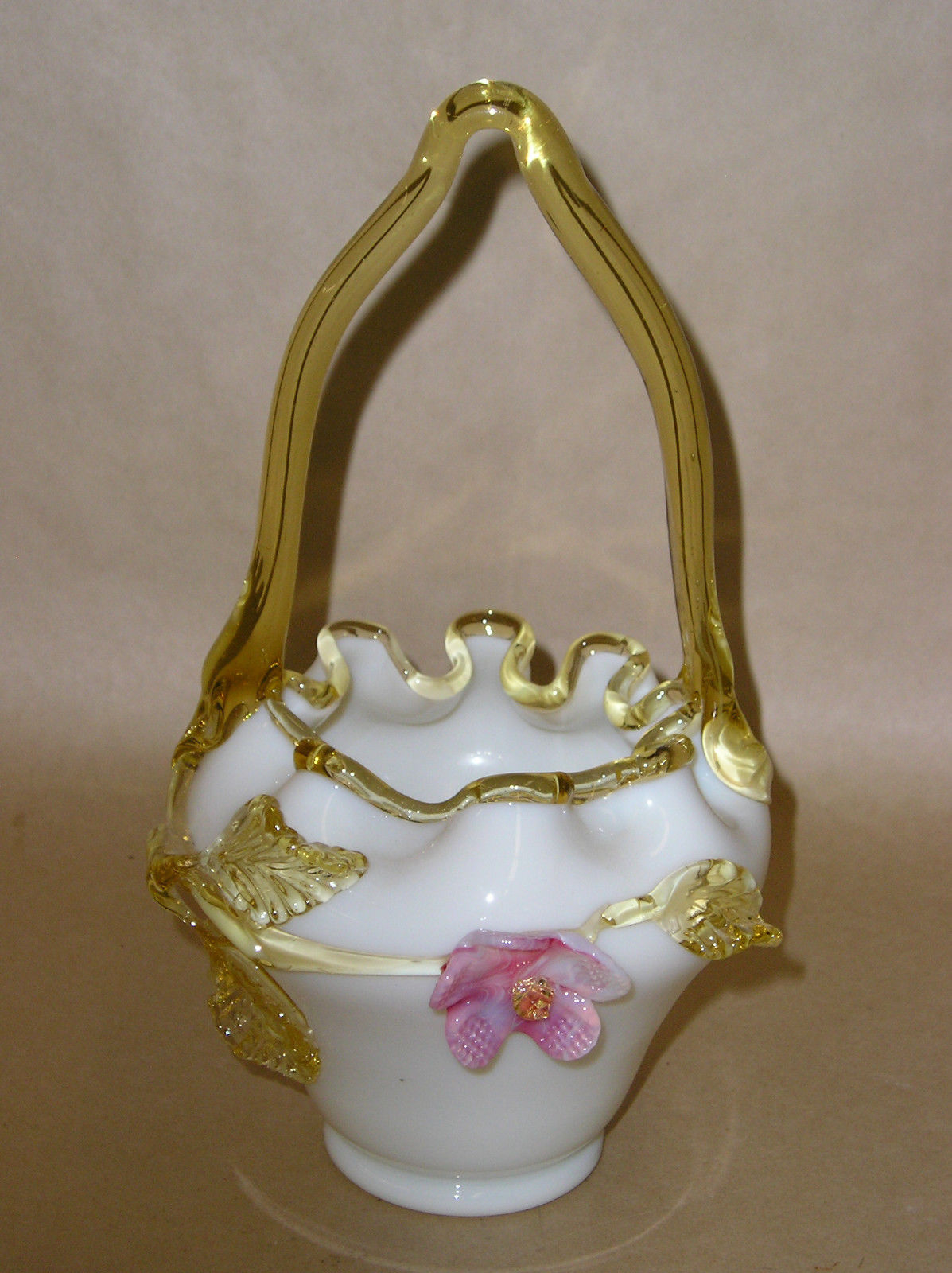 Title (ebay affiliate link): Antique Victorian White Glass Basket Yellow Handle Applied Pink Flower Leaves
