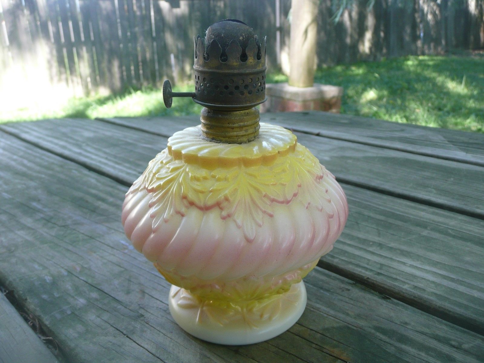 Title (ebay affiliate link): Antique WHITE MILK GLASS painted Miniature kerosene OIL LAMP