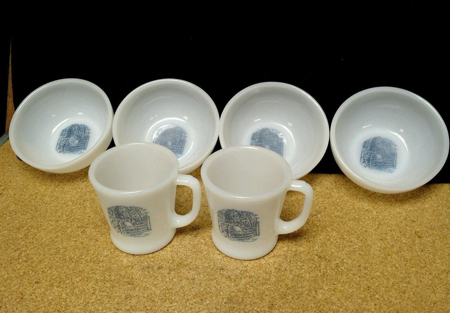 Vintage milk glass Currier and Ives kids on the gate 4 cereal bowls 2coffee mugs