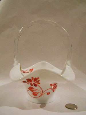 Title (ebay affiliate link): Fenton Glass CRISP WHITE MILKGLASS HP RED FLORAL Holiday BASKET w CRYSTAL HANDLE