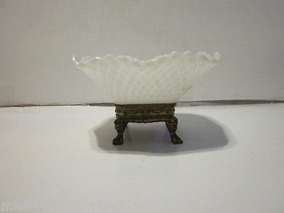 Title (ebay affiliate link): VINTAGE WHITE MILK GLASS DIAMOND HOB NOBS METAL PEDESTAL CANDY DISH