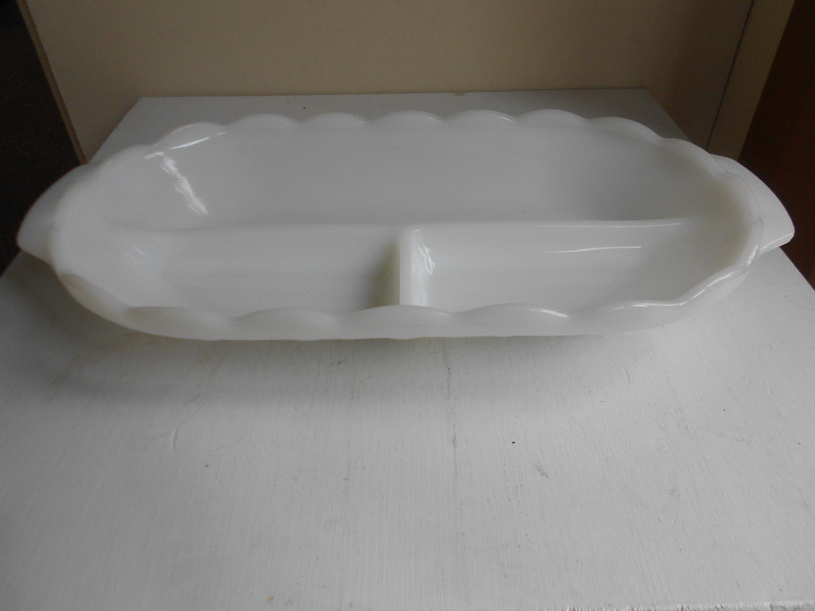 Title (ebay affiliate link): Vintage White Milk Glass Divided Relish/ Serving Tray/ Platter~6 1/2" x 13"