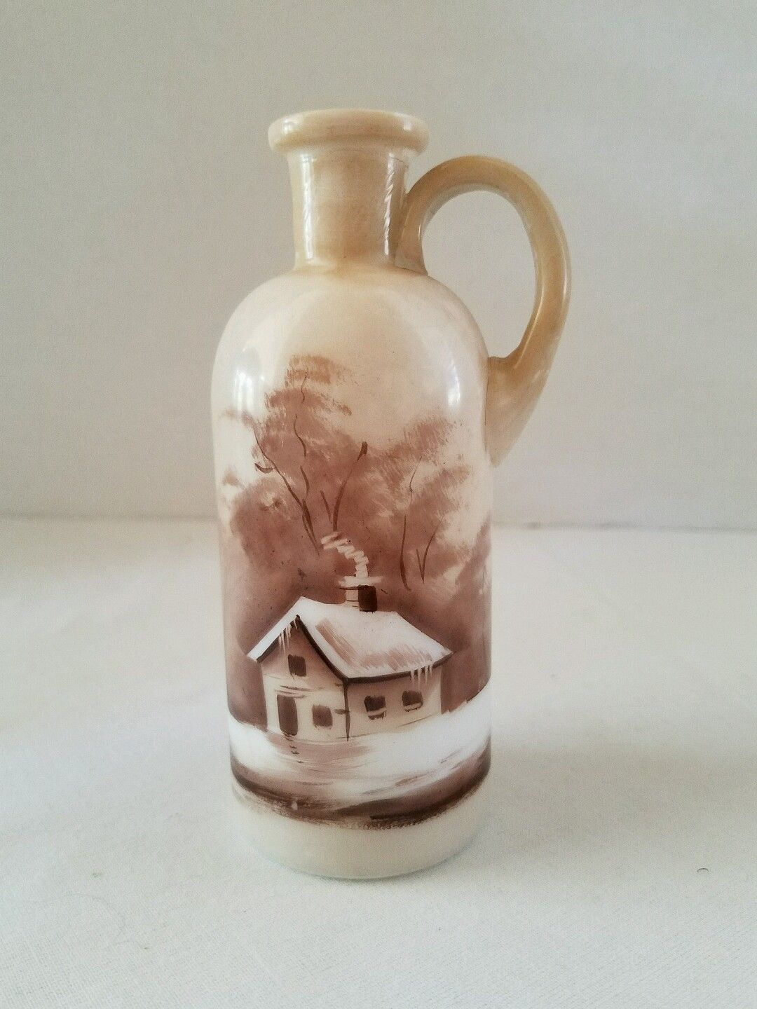 Vintage Hand Painted Milk Glass Jug w/Winter Scene 5" Tall
