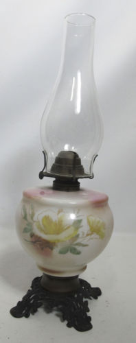 Title (ebay affiliate link): Vintage Floral Milk Glass Oil Lamp w/ Hurricane & Pierced Cast Iron Base NR yqz