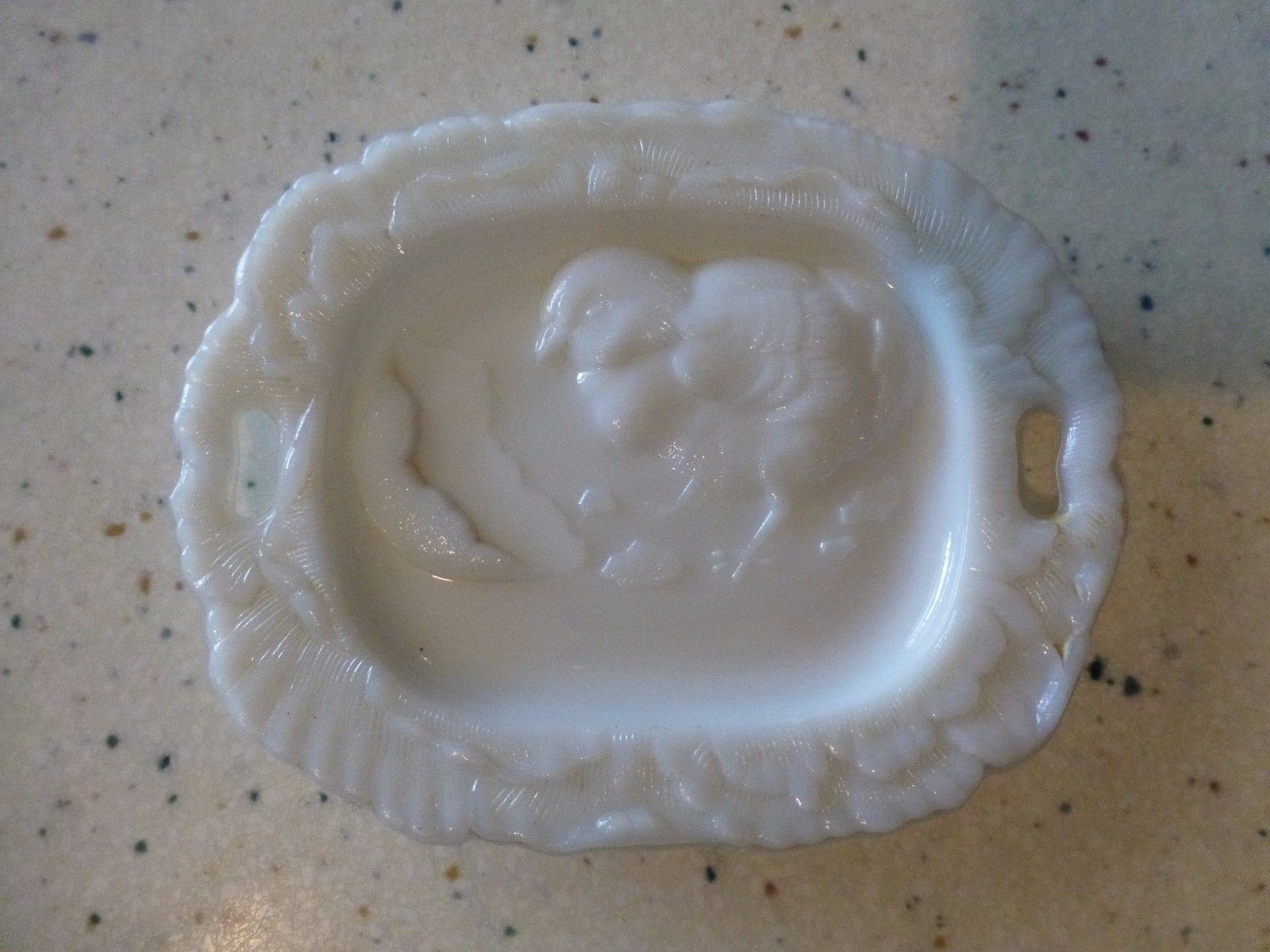 VINTAGE MILK GLASS SMALL PIN TRAY, WITH BABY CHICK AND EGG SHELLS-SWEET!