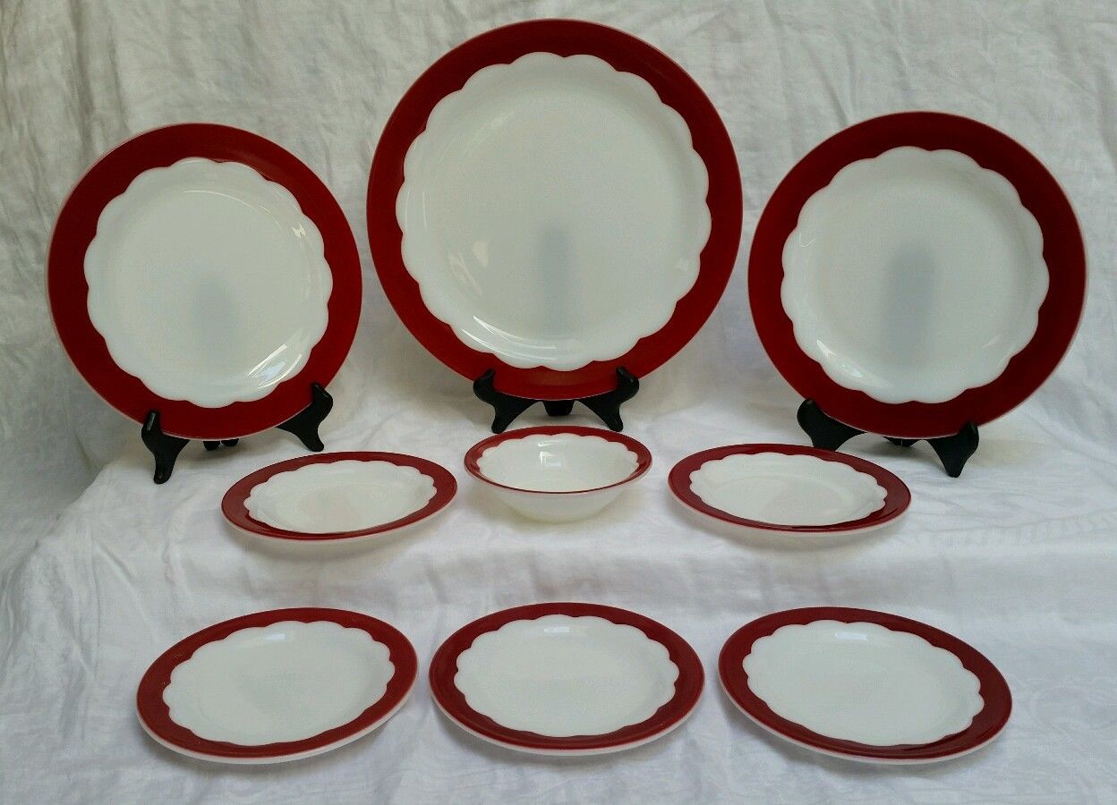 9 Vintage Corning Pyrex White Milk Glass Red Scalloped Border Dinnerware