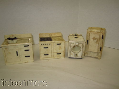 Title (ebay affiliate link): ANTIQUE RENWAL DOLLHOUSE FURNITURE ART DECO KITCHEN SET FRIDGE STOVE SINK WASHER
