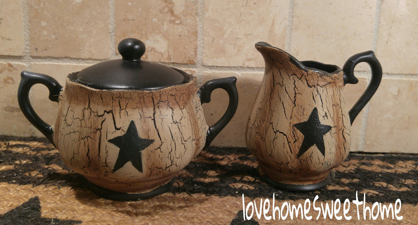 Title (ebay affiliate link): Primitive Crackle Tan & Black Stars Ceramic Mini Sugar Bowl & Creamer Country