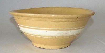 Title (ebay affiliate link): ANTIQUE PRIMITIVE Mixing Bowl YELLOW WARE White Stripe