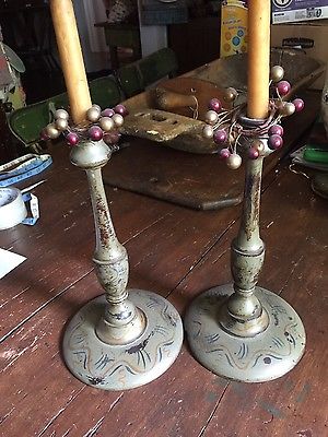 Title (ebay affiliate link): Antique Primitive farmhouse Green Painted Wooden Candlesticks - MUST SEE