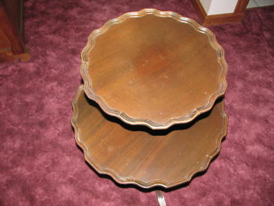VINTAGE MAHOGHANY TWO TIER PIE CRUST END TABLE
