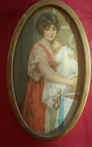 VINTAGE BABY PICTURE IN OVAL Tin FRAME WITH GOLD TRIM