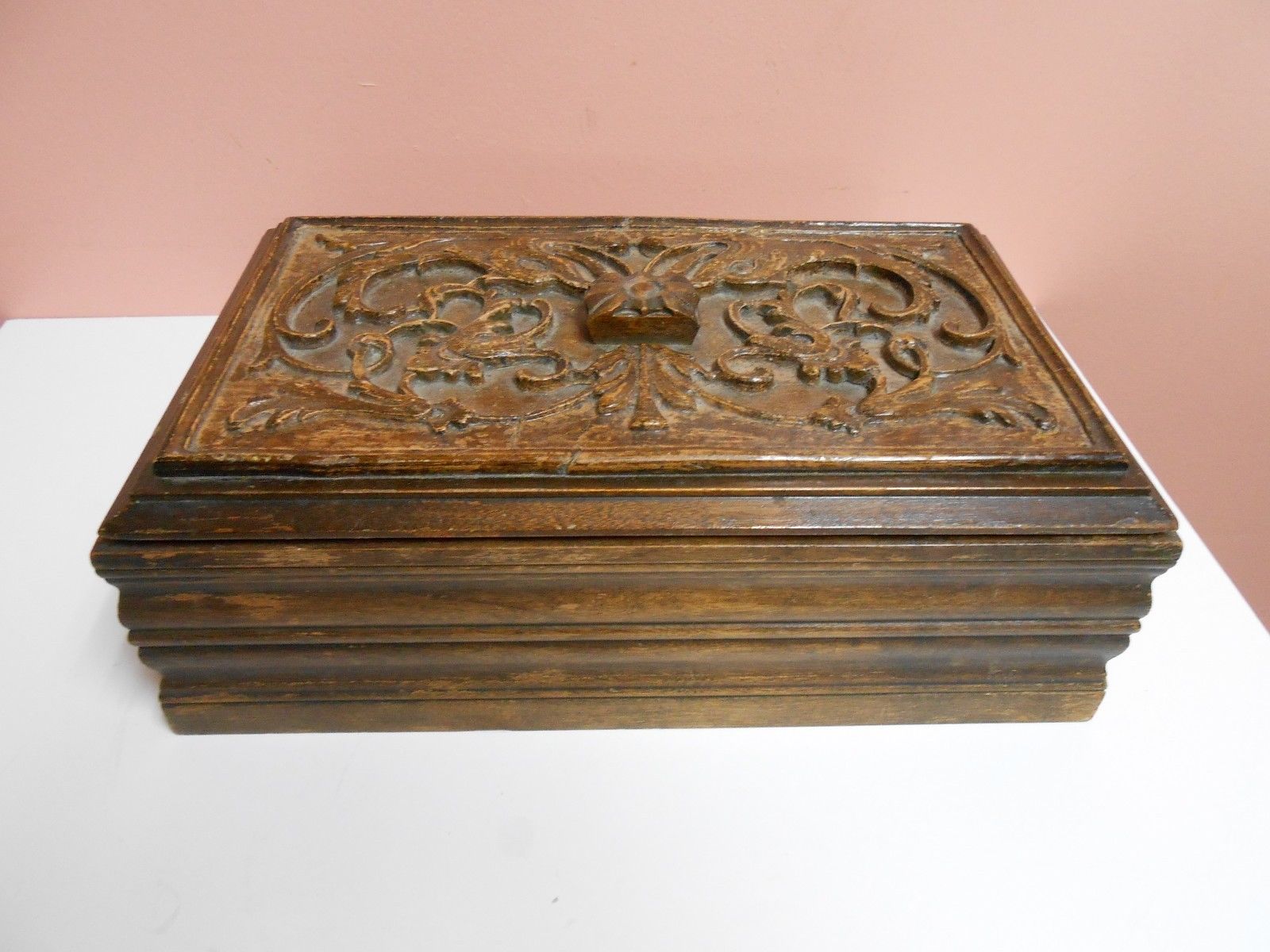 Title (ebay affiliate link): VINTAGE ANTIQUE WOOD STATIONERY BOX with CARVED COVER 13 1/2" x 8 1/4"