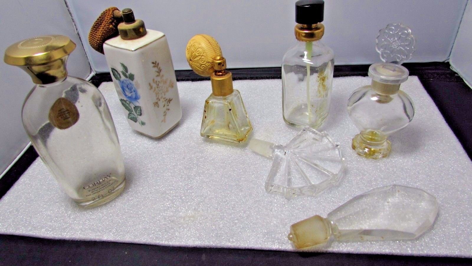 VINTAGE LOT COLLECTIBLE PERFUME BOTTLES W/2 ATOMIZER 2 GLASS STOPPER 1 PORCELAIN