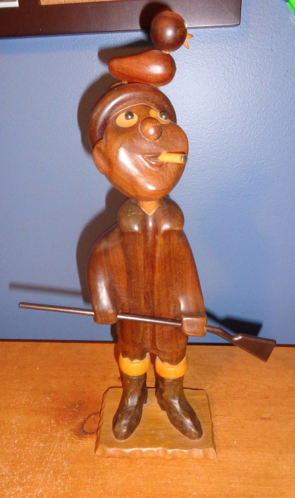 Title (ebay affiliate link): WOODEN CARVED DUCK HUNTER WITH RIFLE & DUCK CALL IN MOUTH ROMER I BELIEVE