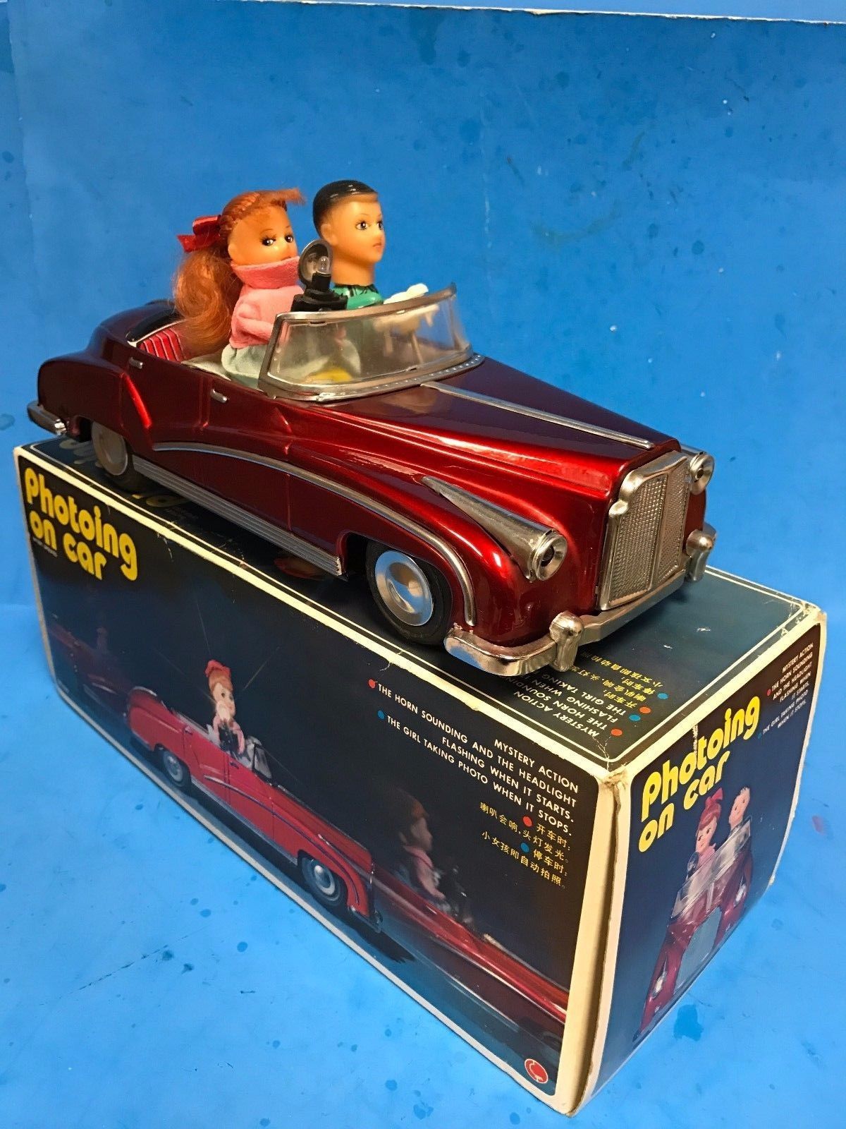 * Vintage Battery Operated Photoing on Car Tin Toy w/ Box