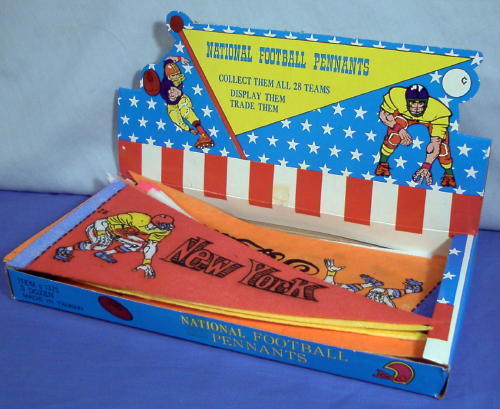 Title (ebay affiliate link): Old Felt Football Pennants Dime Store Counter Top Display Box Full