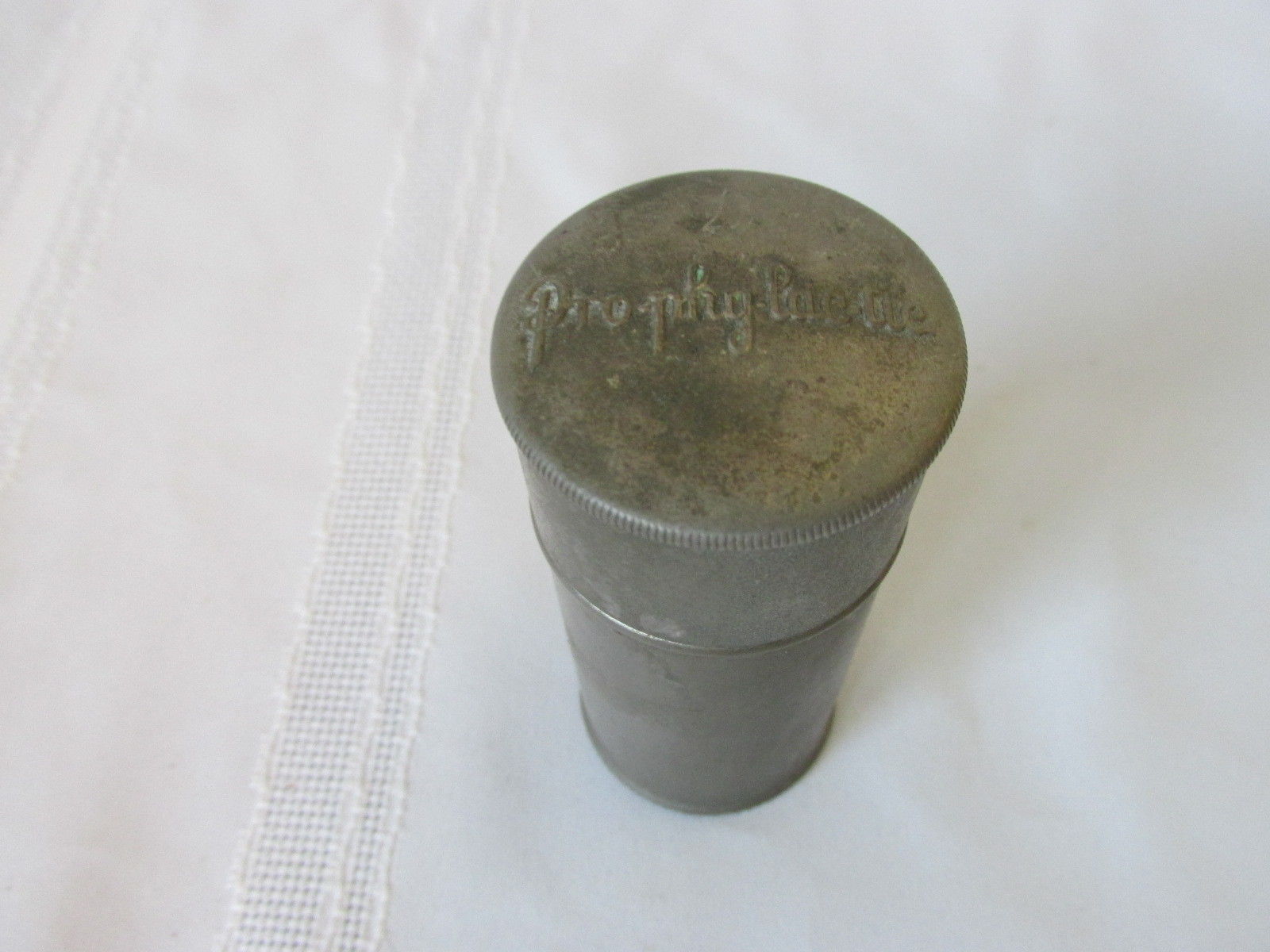 Title (ebay affiliate link): Round Condom Prophylactic Tin Container With Lid 3 1/4" Tall No Makers Mark