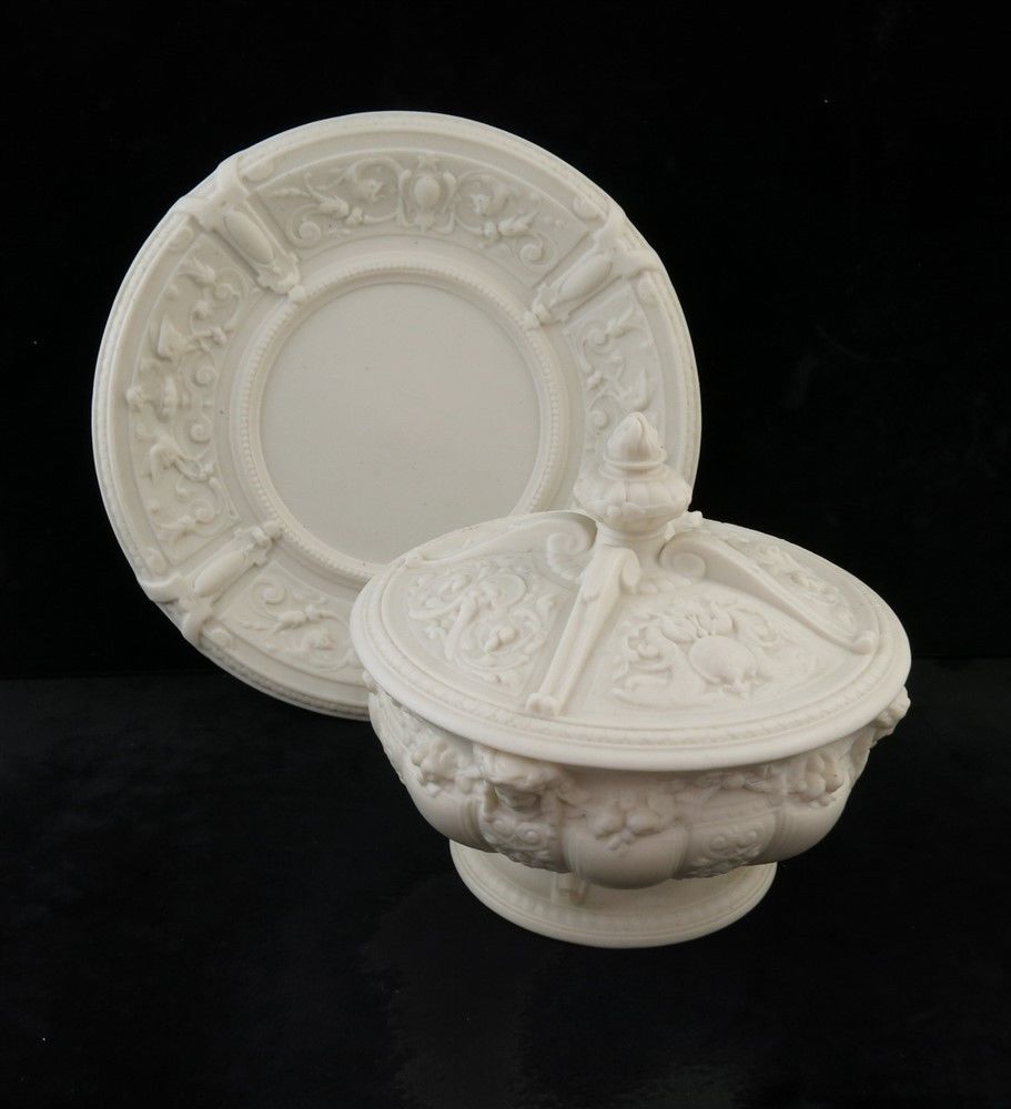 Title (ebay affiliate link): 1852 English Bisque White Ornate Porcelain Soup Tureen w/ Lid & Underplate