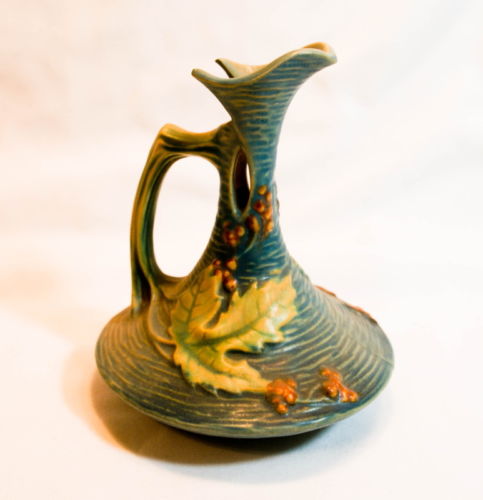 Title (ebay affiliate link): EARLY VINTAGE ROSEVILLE POTTERY BLUE BUSH BERRY EVER VASE PITCHER 1-6