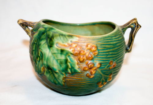 Title (ebay affiliate link): EARLY VINTAGE ROSEVILLE POTTERY GREEN DOUBLE HANDLES BUSHBERRY BOWL 411-4