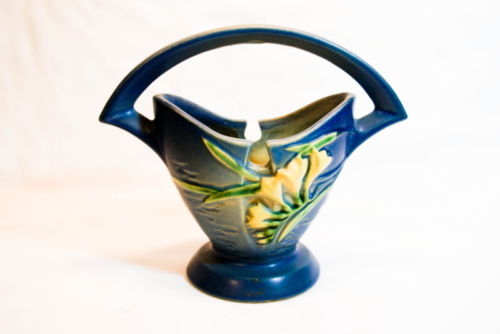 Title (ebay affiliate link): EARLY VINTAGE ROSEVILLE POTTERY BLUE FREESIA BASKET PLANTER BOWL 390-7