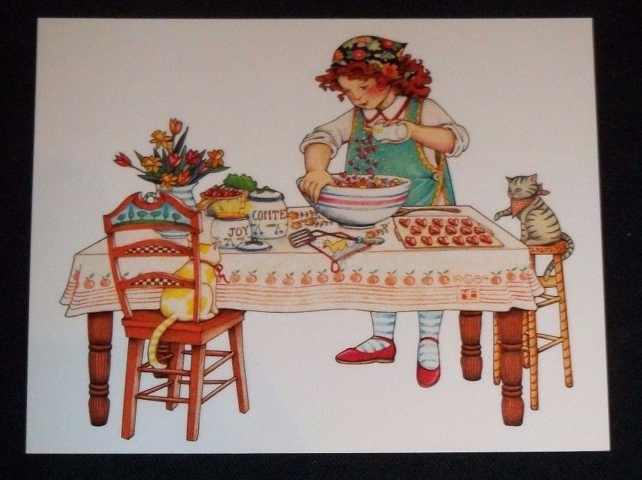 Title (ebay affiliate link): Fridge Magnet w/Mary Engelbreit art Girl Baking, cat sitting on stool
