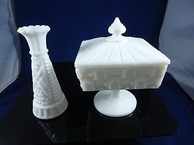 Milk Glass Covered Pedestal Candy Dish and Bud Vase