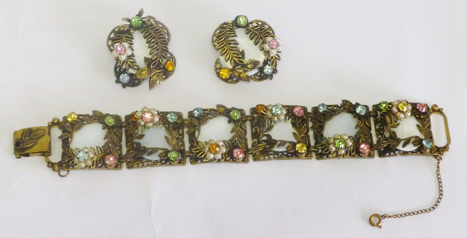 Title (ebay affiliate link): Vintage Bracelet Earring Set Safety Chain Milk Glass Rhinestone Set Parure