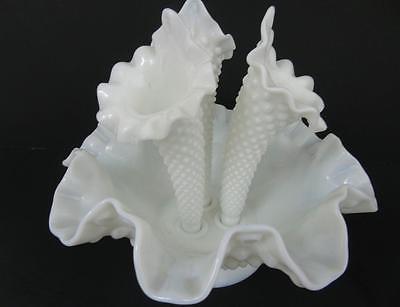 VINTAGE FENTON WHITE HOBNAIL MILK GLASS 3 FLUTED-HORN EPERGNE FLOWER VASE