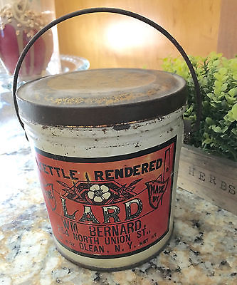 Antique Ad. Primitive Kettle Rendered 2lb. Lard Litho Tin with handle NEW YORK