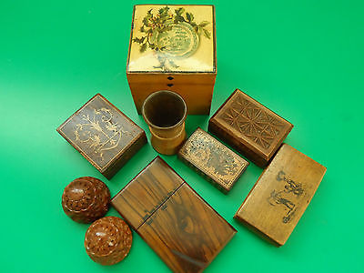 VICTORIAN, EDWARDIAN TREEN BOXS SNUFF, NEEDLE, STAMP, COQUILLA, ect