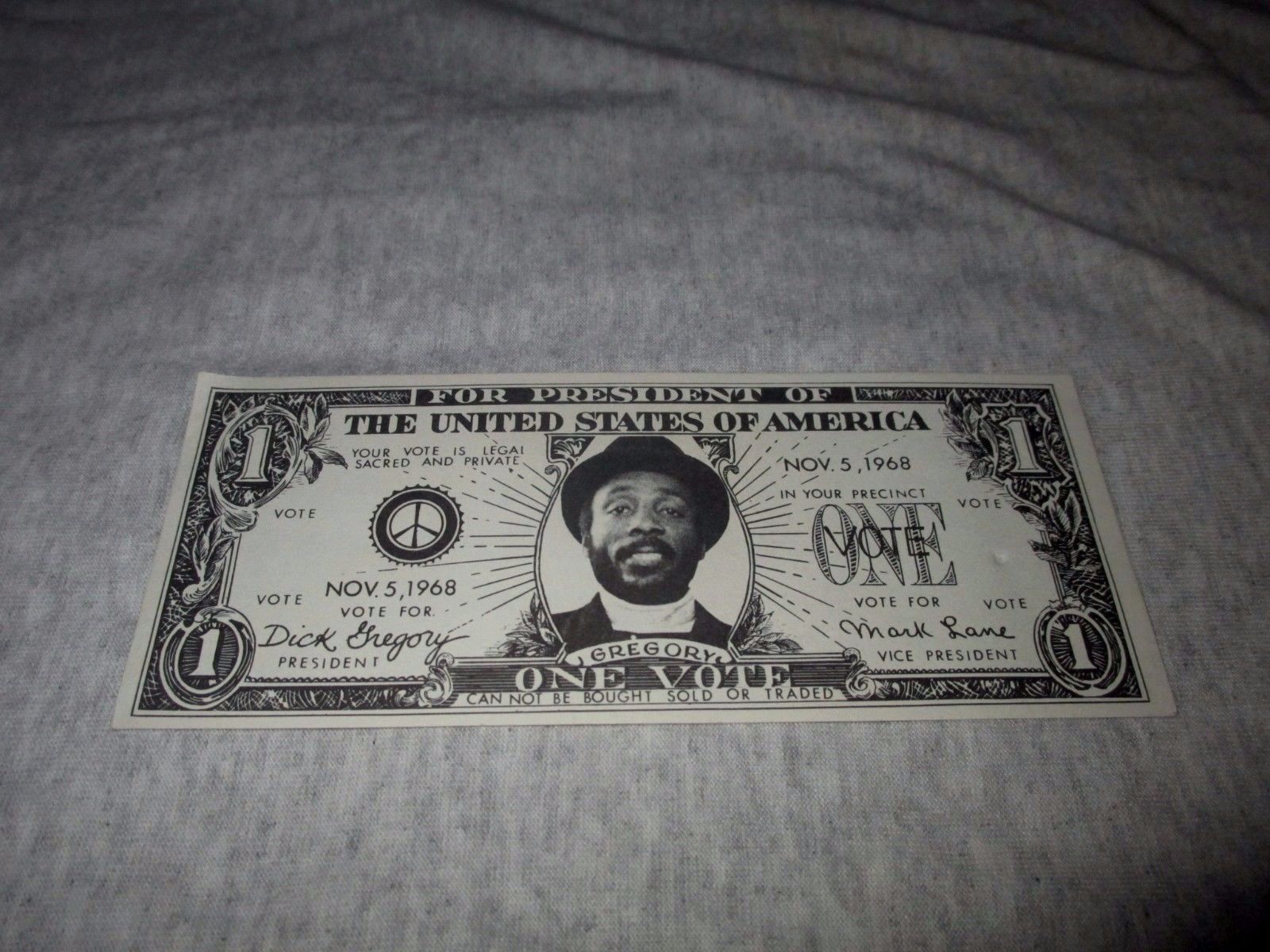 Title (ebay affiliate link): DICK GREGORY FOR PRESIDENT-ANTI-WAR-ORIGINAL 1968 NOVELTY CAMPAIGN DOLLAR BILL