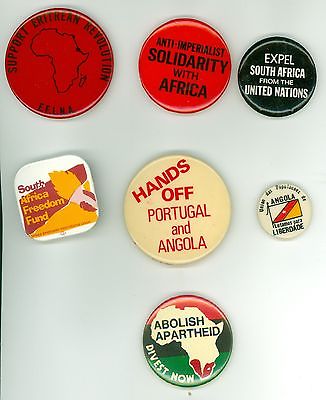 Title (ebay affiliate link): 7 Vintage 1970-80's Black Social Justice Pinback Buttons - Abolish Apartheid