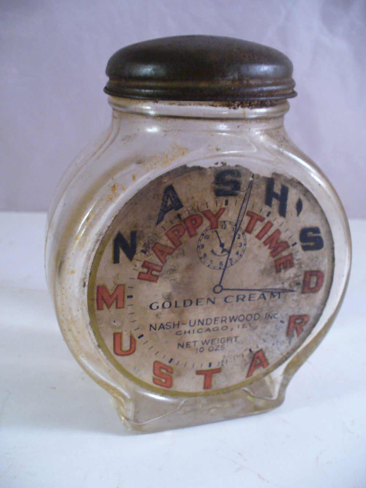 Title (ebay affiliate link): ANTIQUE NASH'S HAPPY TIME GOLDEN CREAM MUSTARD CLOCK GLASS JAR