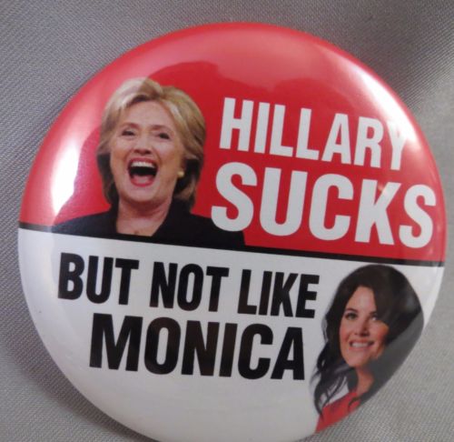 Title (ebay affiliate link): WHOLESALE LOT OF 22 HILLARY SUCKS BUT NOT LIKE MONICA BUTTONS Anti Clinton Trump