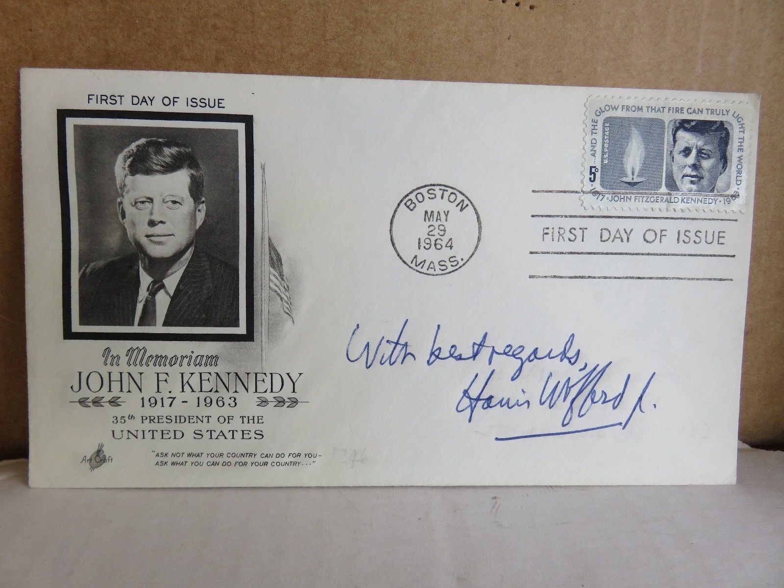 Title (ebay affiliate link): JOHN F. KENNEDY (JFK) 5/29/64 FIRST DAY OF ISSUE ENVELOPE--HARRIS WOFFORD SIGNED