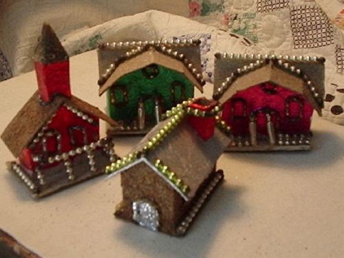 Title (ebay affiliate link): 4 VINTAGE CARDBOARD MICA/FOIL/MERCURY BEAD PUTZ CHRISTMAS VILLAGE HOUSES WOW!