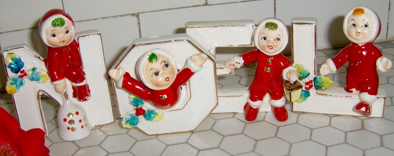 Title (ebay affiliate link): Vintage 40s 50s Christmas Figures JAPAN Noel Letter Set Kids Santa Suits w Tag G