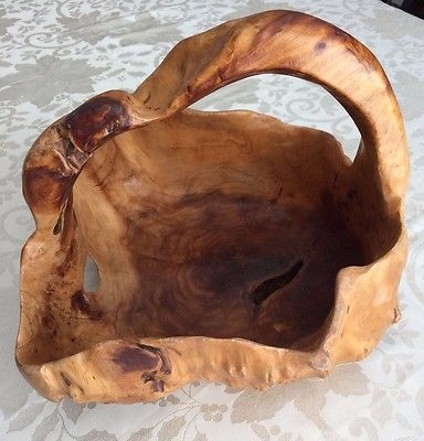 Title (ebay affiliate link): Large Natural Hand Carved Nubby Burl Wood / Root Bowl Basket with Curved Handle