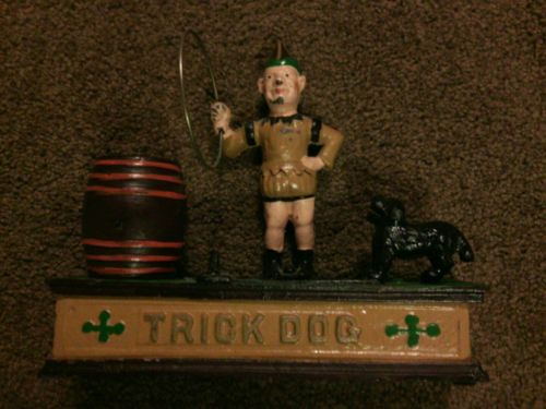 Title (ebay affiliate link): Vintage Cast Iron Bank, Trick Dog - Reproduction Version