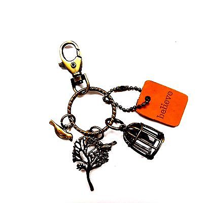 KEY CHAIN VINTAGE BRASS RETRO FOR NECKLACE CUTE CAGE BIRD & TREE PENDANT GIFT