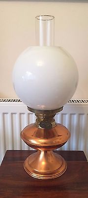 A vintage copper & brass oil lamp & white globe shade twin burner working order